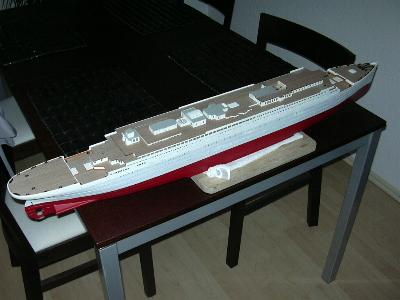 よじれる性質があるためであった。最終的には、蒸気をあててから棒を曲げ、 etappenweise に接着した。舷窓は既に全部穴あけが済んでいる。