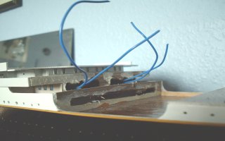 写真のように、ブリッジのすぐ下を貫通して船体のCデッキの下あたりまで斜めの穴を開け、配線する必要があります。