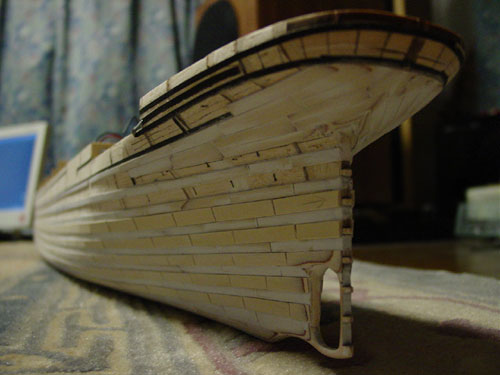これで、船首部分の外板は、ほぼ貼り終えたことになると思います。
