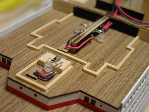 船尾側も同様にデッキ材を貼り点灯チェックしてみた。 雰囲気は出ていると思います。人がいる気配を感じられますか? |