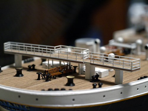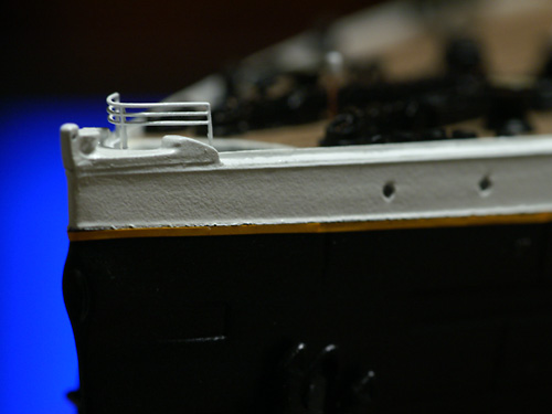 船首の手すりの一部(最先端)を塗装して接着しました。(映画のタイタニックで有名な場所ですね。)先端のクリートは修正したい気分です。 |