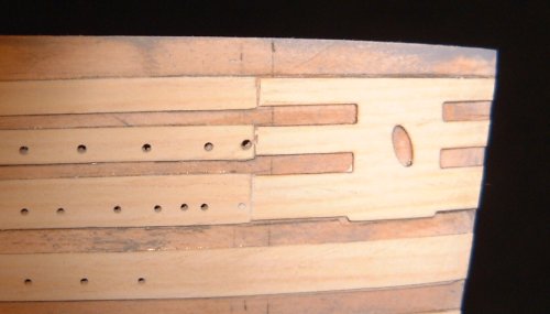 こんなハトメではする事はないが、他の仕事はすこしあった。 甲板排水溝をドリルであけることである。 まず説明書通りに印をつけ 1.5mm の穴を二つ、ほとんどくっつき合うほどにあける。 ドリルの刃を横に動かして 2 つの穴をつなげ、最後に紙ヤスリで仕上げる。 写真は、船壁の内面と外面の両方を示す。甲板排水溝の一つに、上側に飛び出した傷があるのに気付かれたと思う。 どうしてこうなったかはよく分からないが、充填材をちょっと使えば、問題は解決する。 |