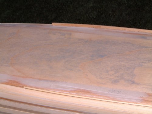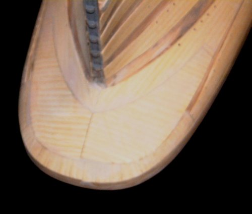 写真では、穴のちょっと船尾よりのベニア部分に、数ヶ所傷が見えると思うが、これは、削り具が滑ったあとである。